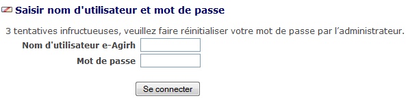 - Si l'utilisateur tente de se connecter 3 fois de suite avec un mauvais couple login/mot de passe, un message d'information lui indique qu'il doit contacter l'administrateur afin de lui réinitialiser son mot de passe.
