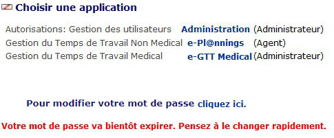 - Lorsqu'à la connexion, la validité du mot de passe approche de l'expiration (15 jours avant), un message informe l'utilisateur qu'il va devoir changer son mot de passe prochainement.