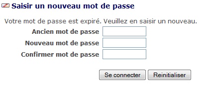 - Lorsqu'à la connexion, le mot de passe est expiré, un message informe l'utilisateur qu'il doit son mot de passe et le formulaire de changement de mot de passe s'affiche.